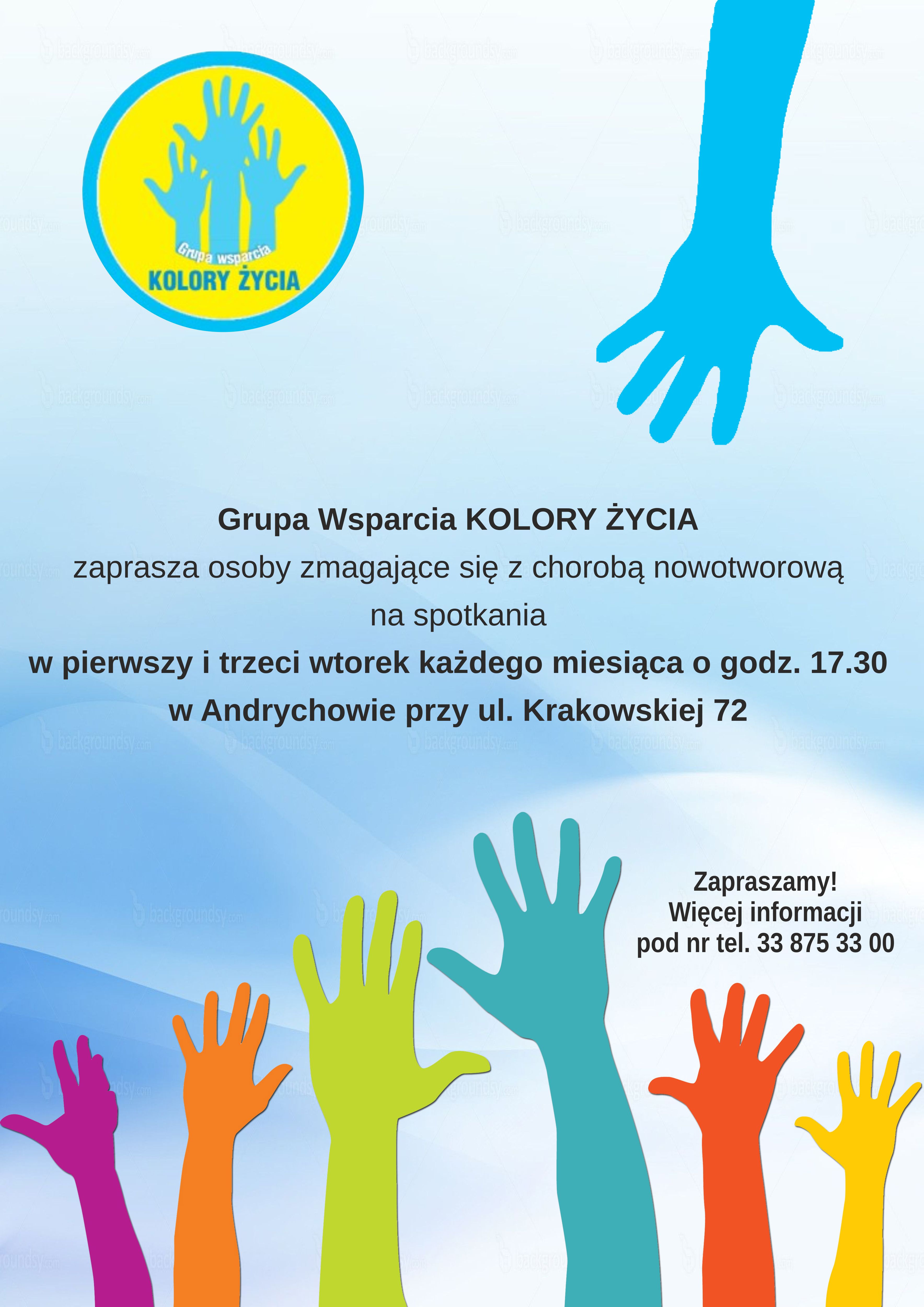 Ośrodek Pomocy Społecznej w Andrychowie zaprasza osoby zmagające się z chorobą nowotworową na spotkania grupy wsparcia „Kolory życia” w pierwszy i trzeci wtorek każdego miesiąca o godzinie 17:30 w Andrychowie przy ul. Krakowskiej 72 . Szczegółowe informacje pod nr tel.: 033-875-33-00.
