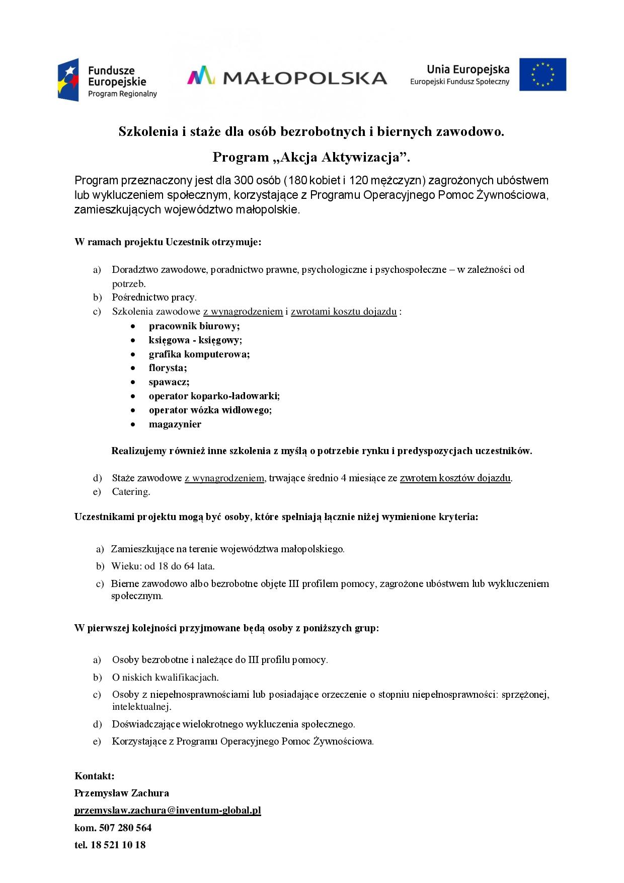 i zawodowej 300 osób (180 kobiet i 120 mężczyzn) zagrożonych ubóstwem lub wykluczeniem społecznym z terenów województwa małopolskiego. Grupą docelową są osoby które