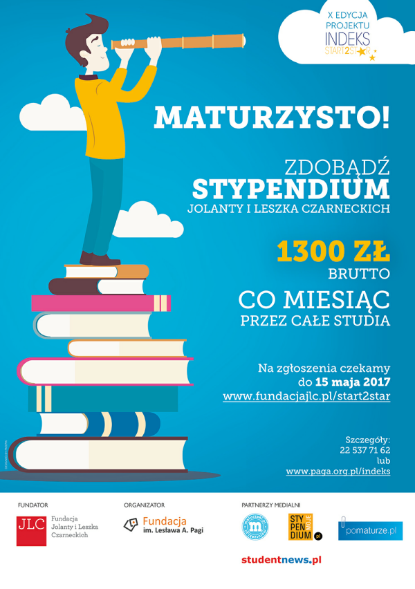 Fundacja im. Lesława A. Pagi w tym roku już po raz dziesiąty rozpoczęła realizację projektu Indeks Start2Star, którego Fundatorem jest Fundacja Jolanty i Leszka Czarneckich. Poszukujemy 15 tegorocznych maturzystów, którzy zostaną laureatami X edycji projektu.
