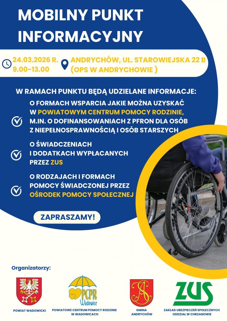 24 marca 2026 r. ponownie zapraszamy mieszkańców gminy Andrychów na spotkanie informacyjne, które odbędzie się w Ośrodku Pomocy Społecznej w Andrychowiew godzinach od 9.00 do 13.00.