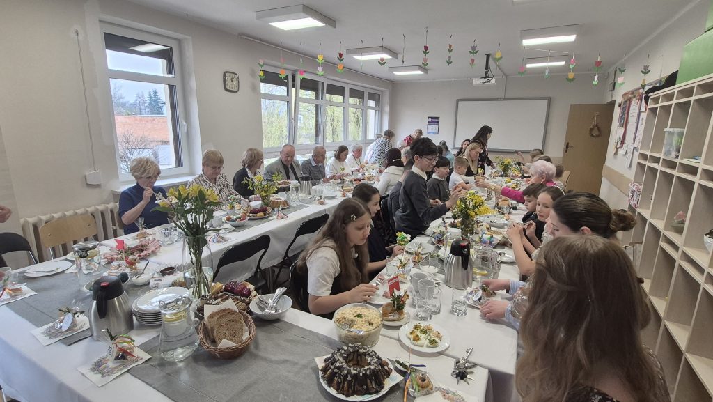 Po twórczej części wszyscy zasiedli do wspólnego śniadania wielkanocnego, dzieląc się radością, życzliwością i świąteczną atmosferą. Spotkanie było doskonałą okazją do integracji międzypokoleniowej oraz budowania relacji opartych na wzajemnym szacunku i współpracy.